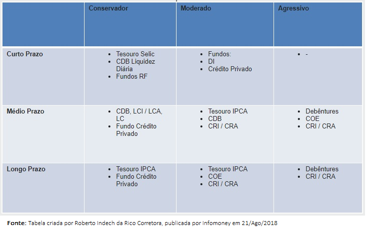 Se você for um pouco mais arrojado e prefere arriscar mais e diversificar, ETFs mais amplos como PIBB11, IVVB11, BOVA11, XFIX11 e muitos outros, além de "boas" ações individuais tanto de dividendos quanto para crescimento são muito indicados para investidores de longo prazo que tenham conta aberta em corretoras. (Veja o problema de escolher "boas ações") Alocação? Ai depende do gosto de cada um. Geralmente para o Brasil, o recomendável é não ficar 100% em renda variável pelo maior risco país, cambial, político, etc. Então algo como 60% RV e 40% RF é algo interessante de se pensar, mas cada um precisa definir seu apetite ao risco e monitorar isto. →Para não ficar só nas nossas sugestões, gostaria de compartilhar uma tabela super ilustrativa do analista chefe da Rico Corretora, Roberto Indech, com sugestões de investimentos em renda fixa de acordo com o perfil de risco e os três pilares que comentamos anteriormente. Clique para ampliar (Atenção: Agosto de 2018)